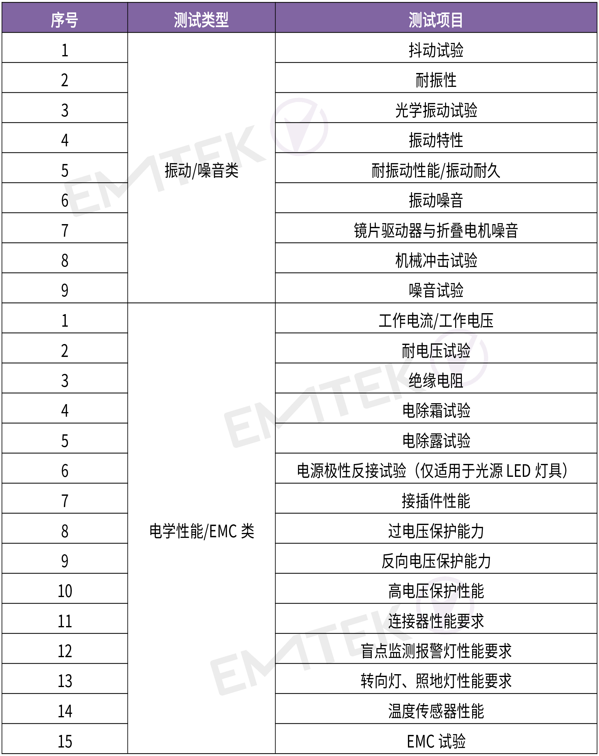 3. 電學試驗:考核后視鏡及其相關(guān)電器件(如轉(zhuǎn)向燈等)環(huán)境和功能試驗前后的電學性能,驗證其是否能正常使用;