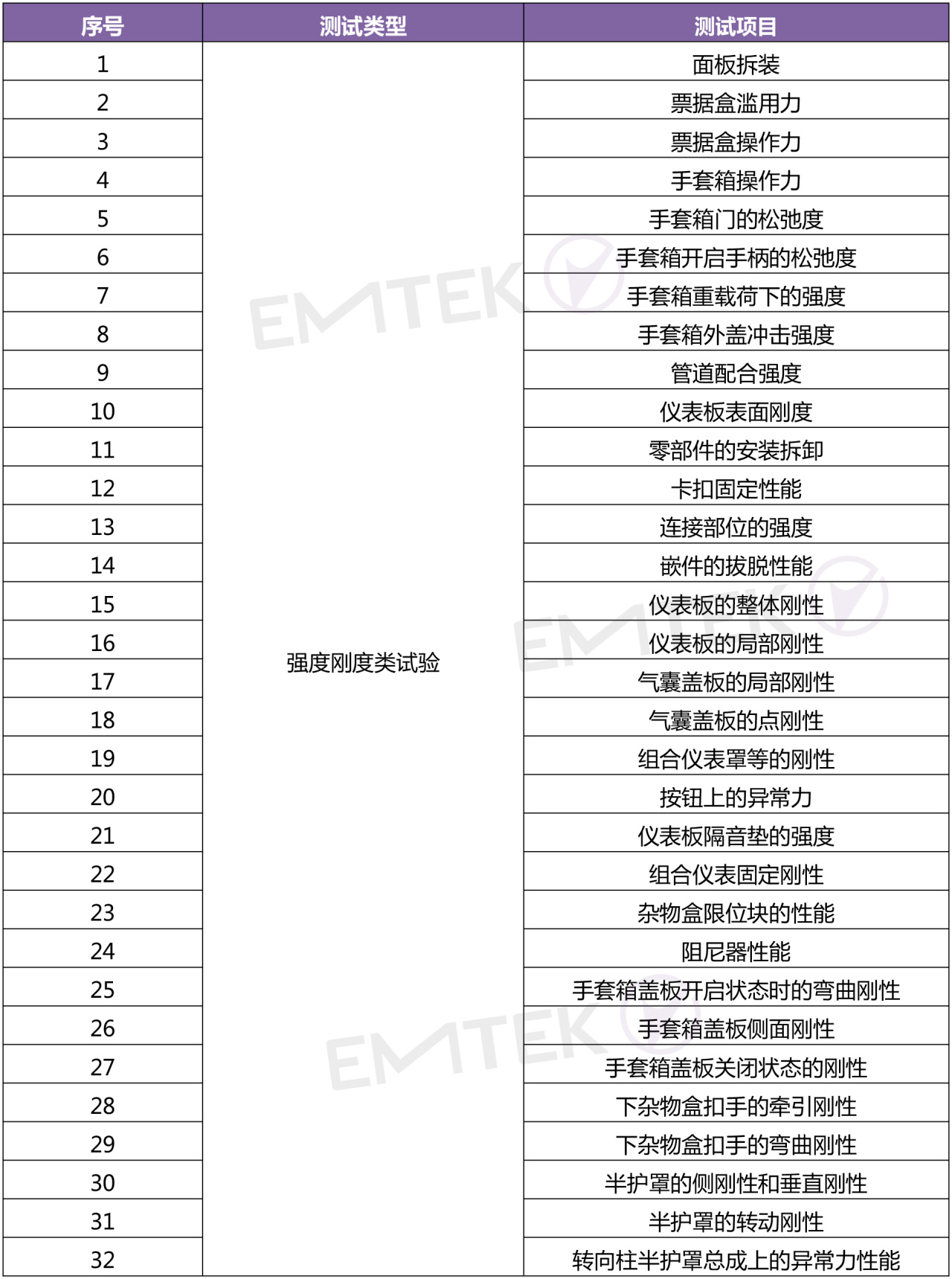 考核儀表板使用過程中承受的強(qiáng)度和剛性、操作功能特性及耐久、振動(dòng)試驗(yàn)、碰撞試驗(yàn),比如票據(jù)盒循環(huán)耐久、手套箱操作耐久、儀表板整體剛度、局部剛性/點(diǎn)剛性、手套箱門剛度、振動(dòng)特性、振動(dòng)耐久、模態(tài)、靜態(tài)頭碰/膝碰、乘員側(cè)氣囊爆破等;