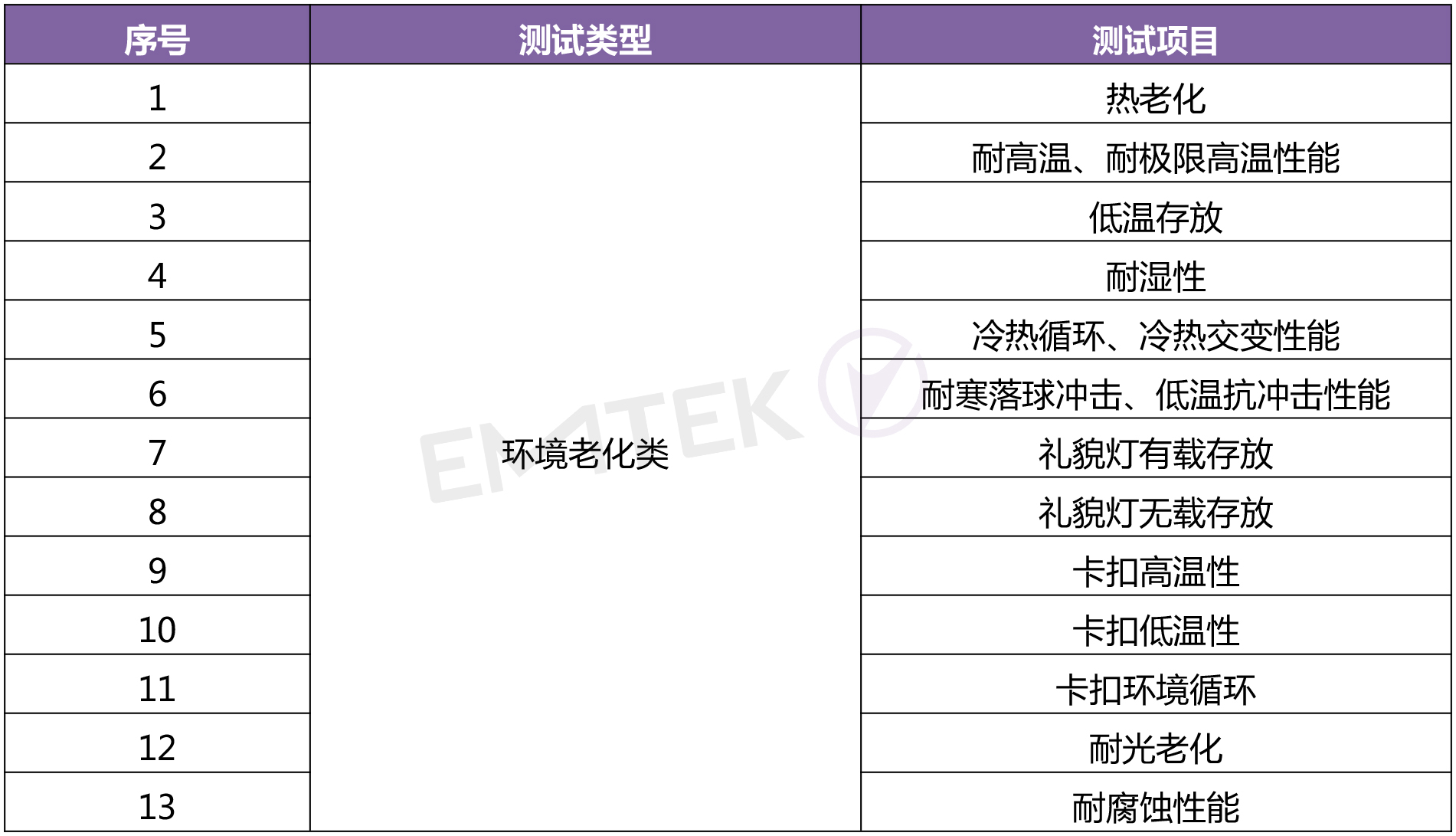 是將產(chǎn)品暴露在自然的或人工的環(huán)境條件下經(jīng)受其作用,以評(píng)價(jià)產(chǎn)品在實(shí)際使用、運(yùn)輸和貯存的環(huán)境條件下的性能,并分析研究環(huán)境因素的影響程度,包含的環(huán)境試驗(yàn)如熱老化、低溫存放、冷熱循環(huán)、低溫沖擊、耐光老化等;
