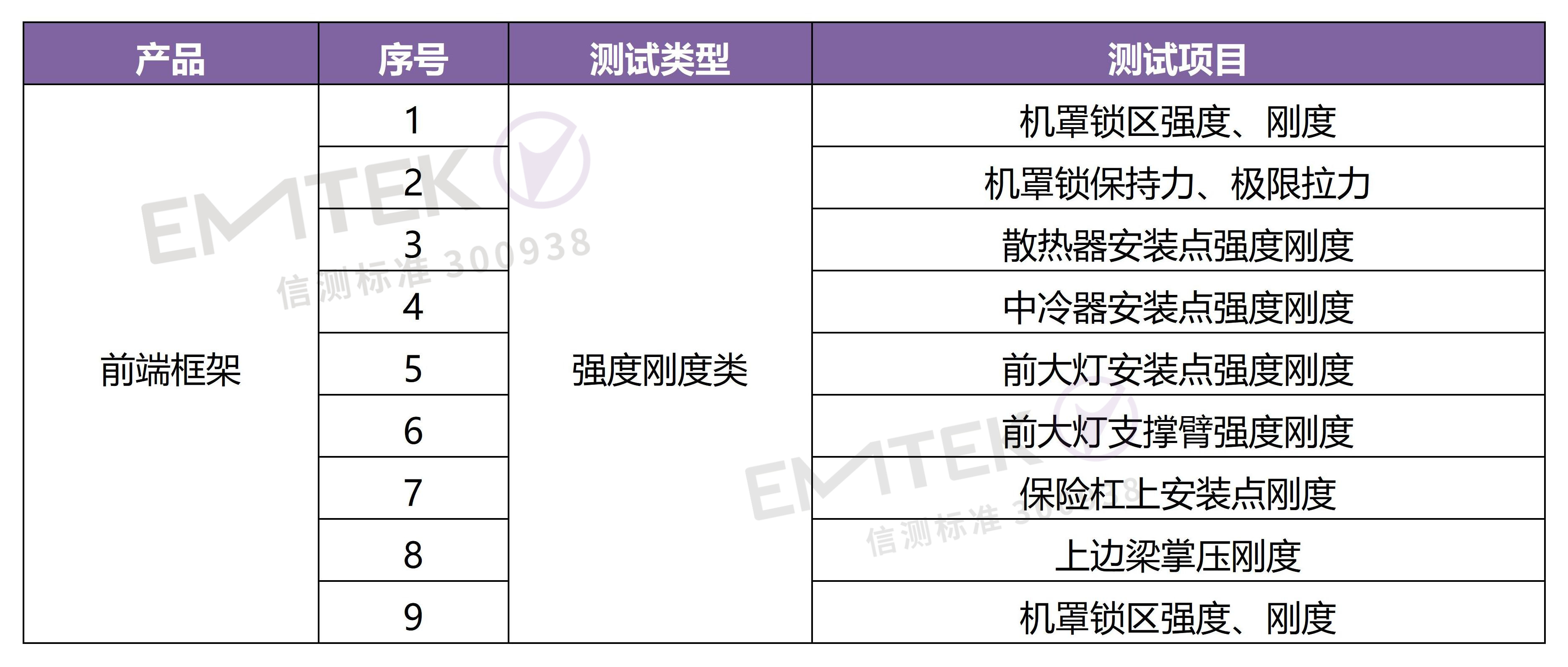 結(jié)構(gòu)件抵抗外力的能力,包括機罩鎖、空調(diào)冷卻系統(tǒng)、前大燈、緩沖墊等結(jié)構(gòu)及安裝點的強度剛度試驗,整體的扭轉(zhuǎn)剛度等;