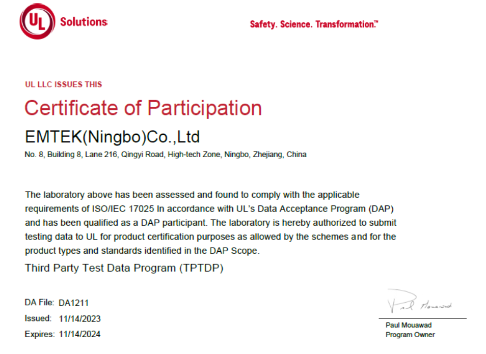 信測標(biāo)準(zhǔn)(寧波)公司長期以來同UL保持密切友好合作,是UL公司多標(biāo)準(zhǔn)TPTDP免目擊實(shí)驗(yàn)室和WTDP目擊實(shí)驗(yàn)室,為客戶縮短認(rèn)證周期、節(jié)約差旅費(fèi)/成本,更好體驗(yàn)信測標(biāo)準(zhǔn)一站式、通全球的優(yōu)質(zhì)服務(wù)。