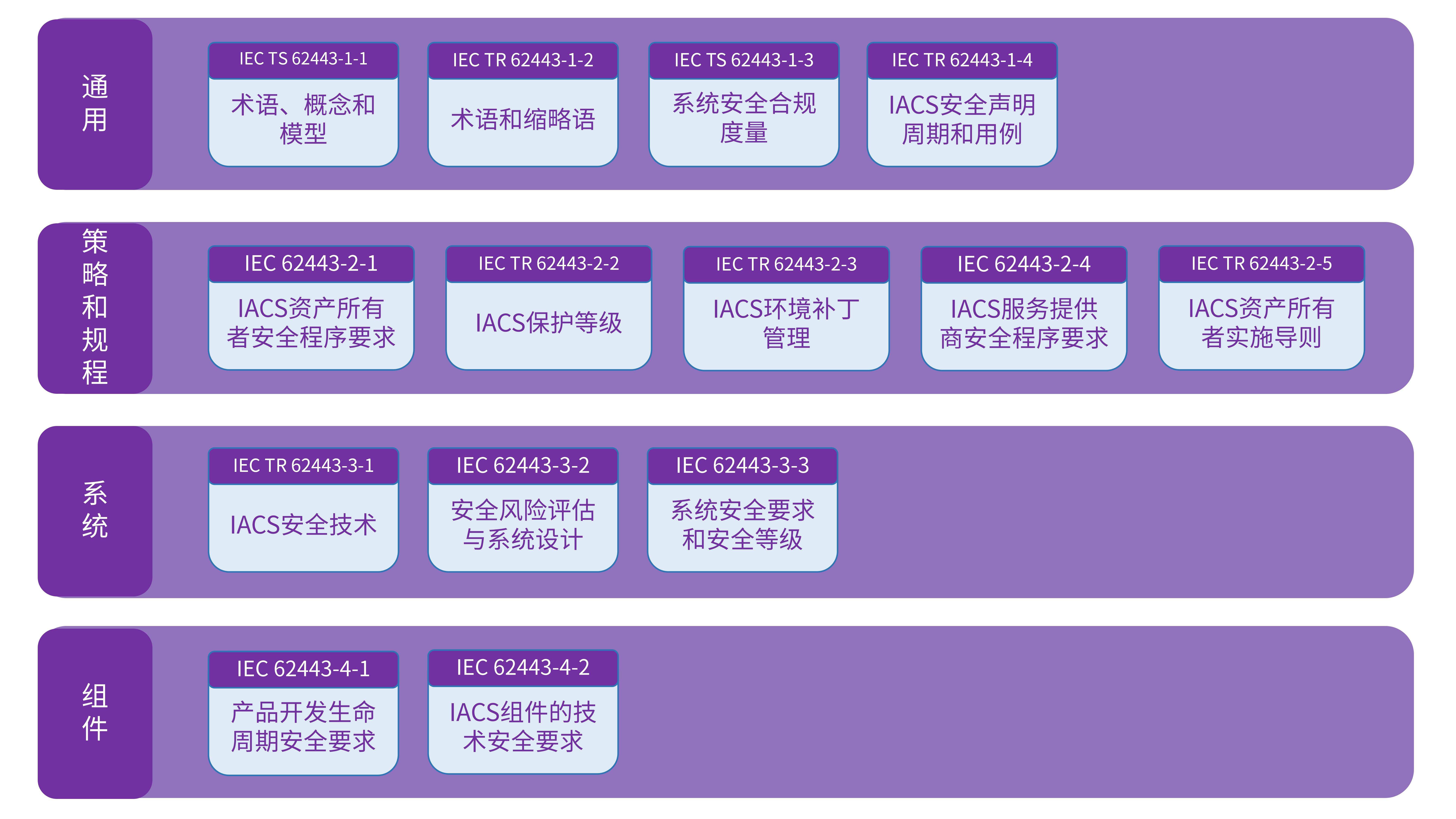 (4) 組件(IEC 62443-4-x):包含兩份文件,IEC 62443-4-1規(guī)定安全產品開發(fā)生命周期要求,IEC 62443-4-2規(guī)定系統(tǒng)組件的技術安全要求。