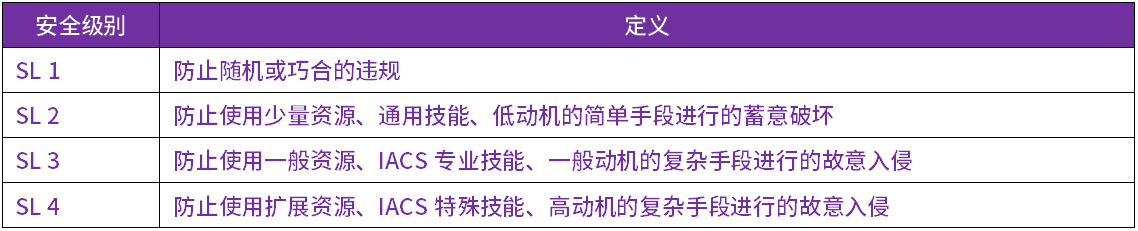 以上每個安全大類均定義了多個CR和RE(增強)來映射到不同的安全級別SL中,安全級別越高,安全需求要求也越高。IEC 62443-4-2中定義了四種安全級別SL,如下: