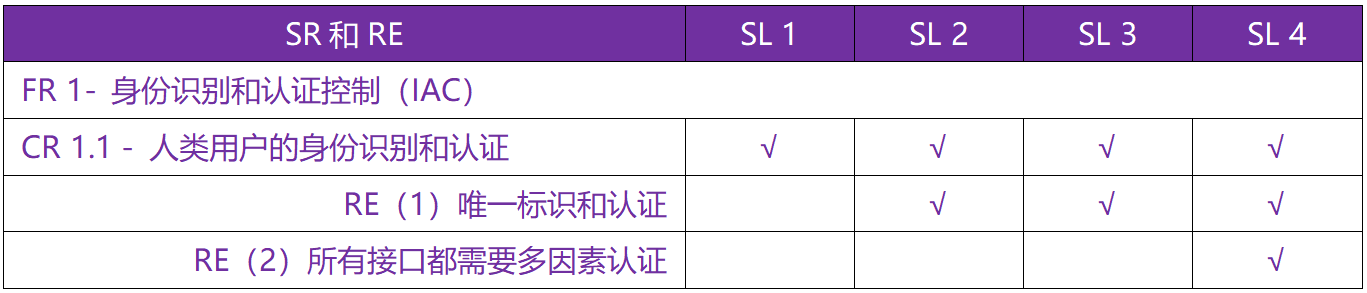 上面截圖所示,當要達到安全級別3級,需要同時滿足CR 1.1、RE(1)的要求。當要達到安全級別4級,需要同時滿足CR 1.1、RE(1)、RE(2)的要求。