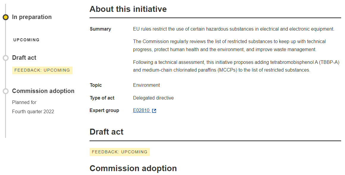 根據(jù)授權(quán)法案的立法流程,歐盟委員會在咨詢專家組意見后著手準備法案的草案,并提供給公眾及利益相關(guān)者評議。該動議所涉及的法案計劃在2022年第4季被正式采納成為RoHS指令的修訂案。