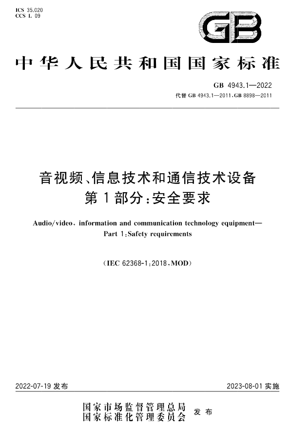 2022年07月19日,工業(yè)和信息化部正式發(fā)布國家標(biāo)準(zhǔn)GB 4943.1-2022,也就是《音視頻、信息技術(shù)和通信技術(shù)設(shè)備 第1部分:安全要求 Audio/video,information and communication technology equipment—Part 1: Safety requirements》,新國標(biāo)將于2023年8月1日全面實(shí)施。該標(biāo)準(zhǔn)修改采用國際標(biāo)準(zhǔn)IEC 62368-1:2018,將代替國家標(biāo)準(zhǔn)GB 4943.1-2011和GB 8898-2011。