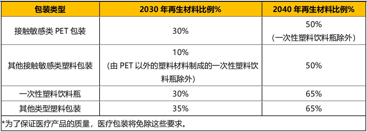 再生材料比例目標PPWR 提案針對特定包裝類別,規(guī)定了強制性再生材料含量比例,相關(guān)要求自 2030 年 1 月 1 日起實施。