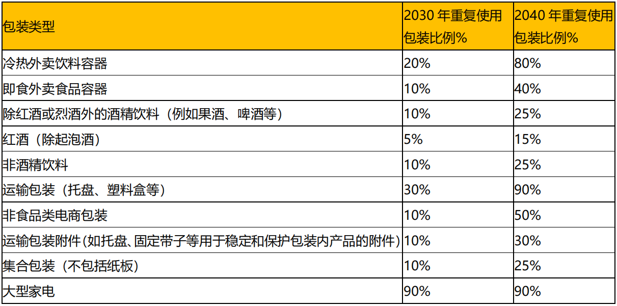 PPWR 提案擬定了運輸包裝、電商包裝等的強制性重復使用包裝比例,自 2030 年 1 月 1 日起實施。