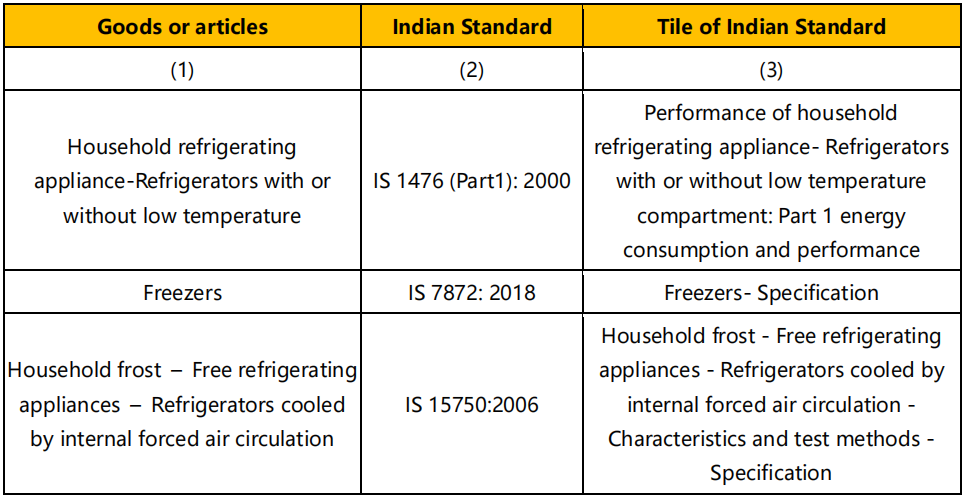 2022 年 12 月 14 日,印度標(biāo)準(zhǔn)局(BIS)發(fā)布公告,制冷設(shè)備強(qiáng)制安規(guī) ISI 認(rèn)證的實(shí)施時(shí)間再次推遲實(shí)施,下列產(chǎn)品的強(qiáng)制日期推遲到 2024 年 1 月 1 日。