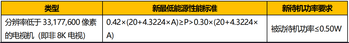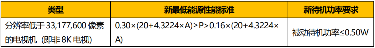 自2024年4月1日起,所有在新加坡銷售的分辨率低于33,177,600像素的電視機(即非8K電視)須滿足新的MEPS(新的最低能源性能標準)要求如下表: