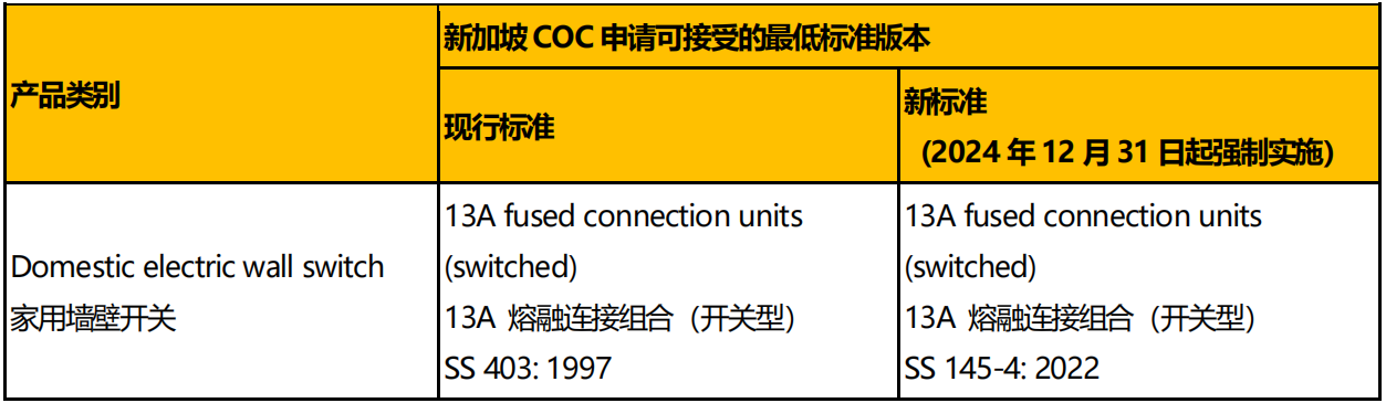 2023 年3 月31 日,新加坡消費品安全辦公室(CPSO)發(fā)布通告CPSO-310323-08, 對《消費者保護(安全要求)條例》(CPSR)列出的13A 熔融連接組合(開關型)的安全標準進行了最新修訂,自2024 年12 月31 日起,新加坡安規(guī)申請接受的最低安全標準版本為SS 145-4: 2022。