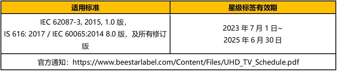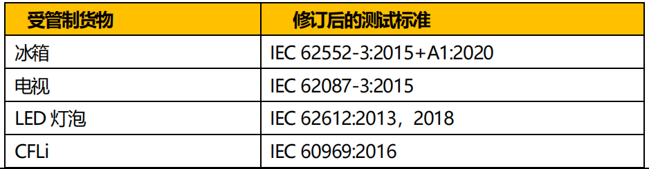 自2024 年1 月1 日起,冰箱,電視機,LED 燈泡,CFLi 的現(xiàn)行測試標準將被下列適用新標準所取代,如下表所示。生效日之后,所涉及的受管制貨物的新注冊和續(xù)期注冊,應按照修訂后的測試標準進行測試:
