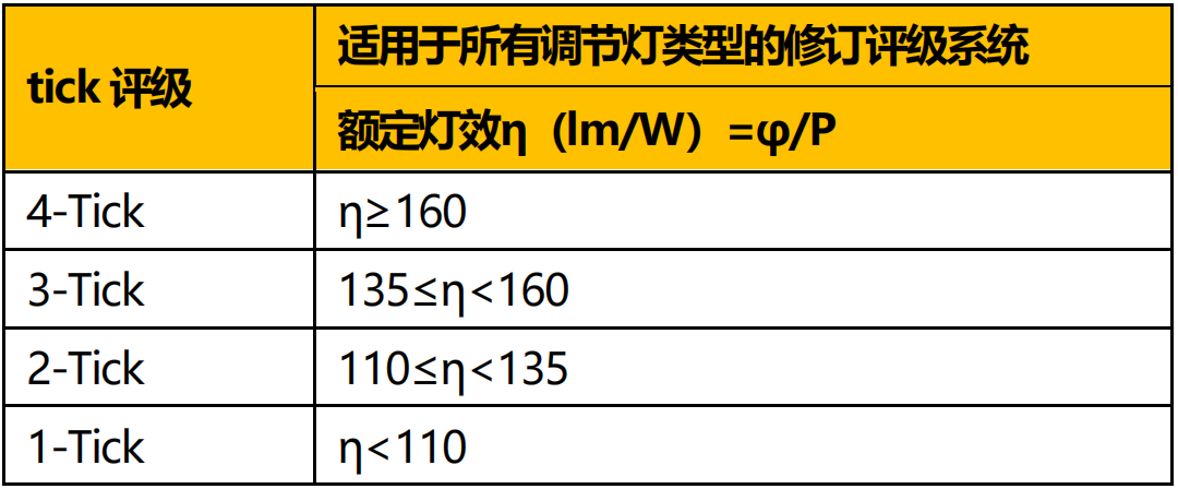 (2)所有受管制的燈泡 tick 評級將整合為單一評級,如下表: