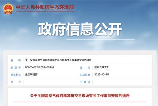 2023 年 10 月 24 日,生態(tài)環(huán)境部發(fā)布關于全國溫室氣體自愿減排交易市場有關工作事項安排的通告。