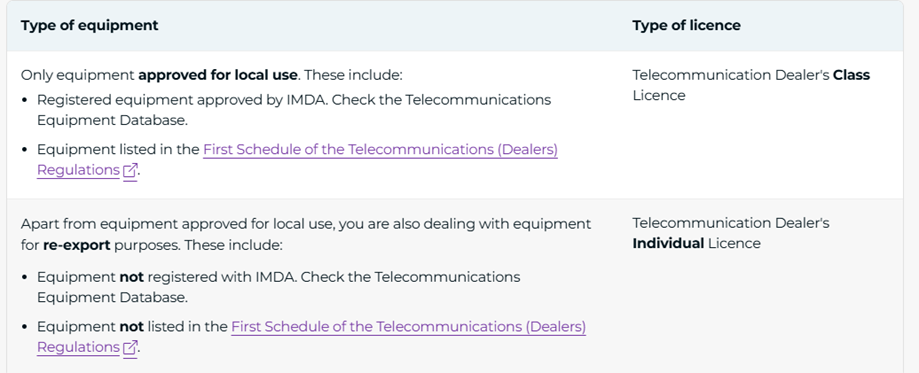 除非事先獲得IMDA的批準(zhǔn),否則不得進(jìn)口或再出口違禁設(shè)備。請(qǐng)致信 info@imda.gov.sg
