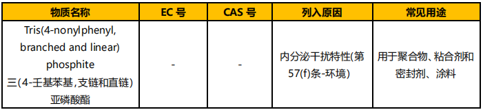 此外,ECHA 還更新了之前列入 SVHC 清單的第 21 批物質(zhì)“三(4-壬基苯基,支鏈和直鏈)亞磷酸酯(TNPP)其中 4-壬基苯酚(支鏈和直鏈)(4-NP)含量大于等于 0.1%”的條目。