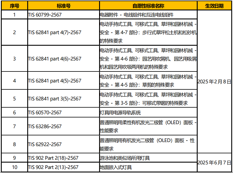 泰國工業(yè)標(biāo)準(zhǔn)協(xié)會(huì)(TISI)于 2025 年2 月 7 日更新TIS 標(biāo)準(zhǔn)清單,新增多項(xiàng)自愿性標(biāo)準(zhǔn),見表 3。