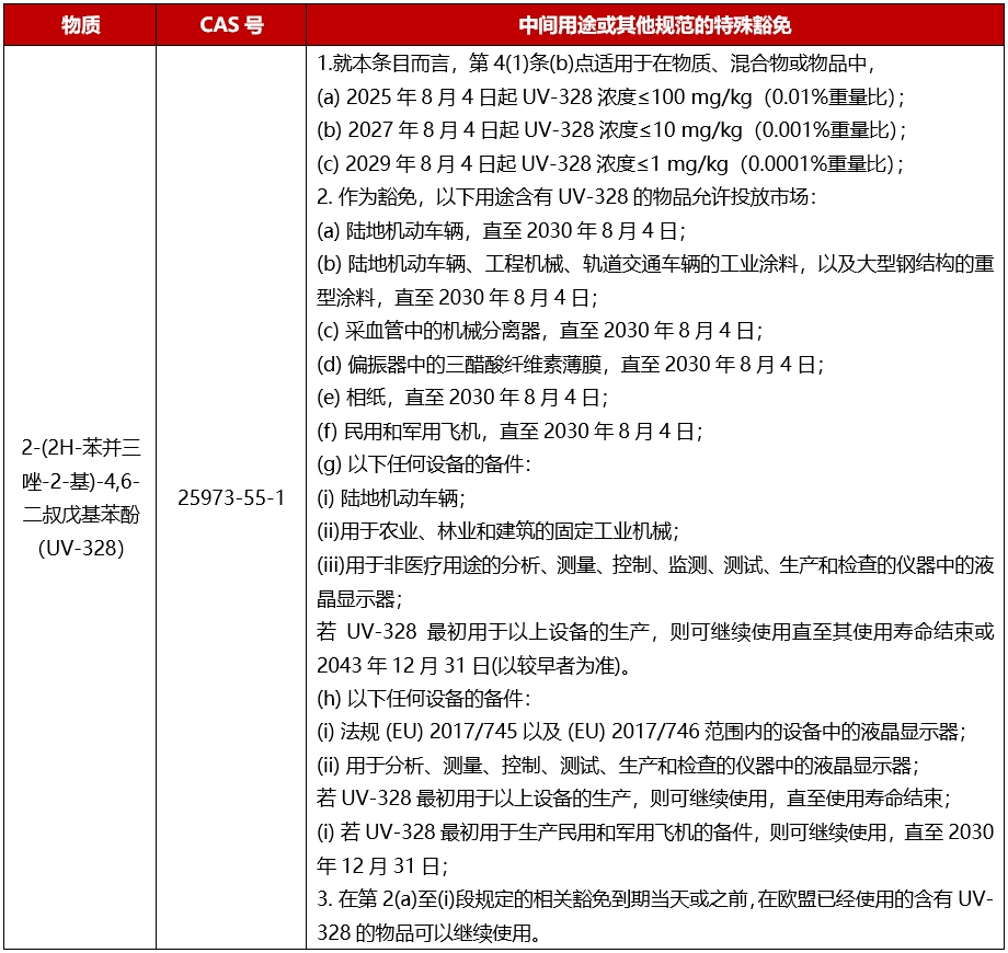 對(duì) POPs 法規(guī)附錄 I 的 A 部分表格中“全氟辛酸(PFOA)及其鹽類和相關(guān)化合物”條目的修訂如下: