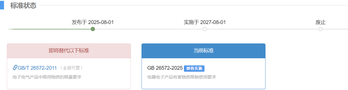 2025 年 8 月 1 日,國(guó)家市場(chǎng)監(jiān)督管理總局(國(guó)家標(biāo)準(zhǔn)化管理委員會(huì))發(fā)布 2025 年第 18 號(hào)標(biāo)準(zhǔn)公告,批準(zhǔn)發(fā)布 35 項(xiàng)強(qiáng)制性國(guó)標(biāo),其中包括中國(guó) RoHS 第一份強(qiáng)制性國(guó)標(biāo)《電器電子產(chǎn)品有害物質(zhì)限制使用要求》(GB 26572-2025),該標(biāo)準(zhǔn)將于 2027 年 8 月 1 日正式實(shí)施,并全面替代原有推薦性國(guó)標(biāo) GB/T 26572-2011。