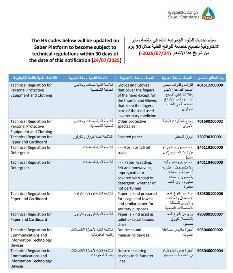 2025 年 7 月,沙特阿拉伯標(biāo)準(zhǔn)組織 SASO(Saudi Standards, Metrology and Quality Organization)發(fā)布通知,宣布部分產(chǎn)品將在該通知發(fā)布日期(2025 年 7 月 24 日)的 30 天內(nèi)被納入管控清單。自生效之日起,相關(guān)產(chǎn)品須符合相應(yīng)的技術(shù)法規(guī)要求。