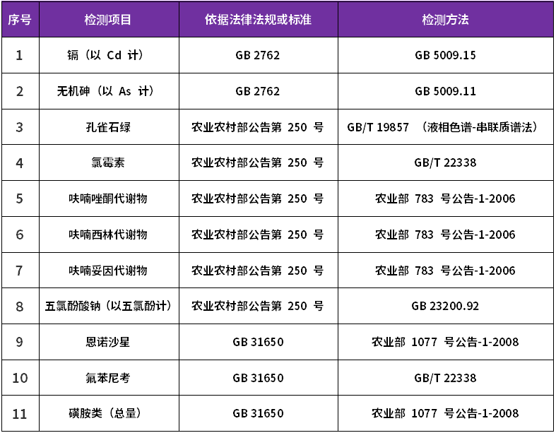 深圳信測(cè)標(biāo)準(zhǔn)技術(shù)服務(wù)有限公司作為專(zhuān)業(yè)的第三方食品檢測(cè)機(jī)構(gòu),具備食品檢驗(yàn)機(jī)構(gòu)資質(zhì)認(rèn)定證書(shū)(CMA)等權(quán)威資質(zhì),且近年來(lái)承擔(dān)廣東省多地市各級(jí)市場(chǎng)監(jiān)督管理局食品及農(nóng)產(chǎn)品安全監(jiān)督抽檢任務(wù),累積了豐富的食品及農(nóng)產(chǎn)品檢測(cè)經(jīng)驗(yàn);能夠提供淡水螺的檢測(cè)服務(wù)。具體檢測(cè)項(xiàng)目見(jiàn)下表: