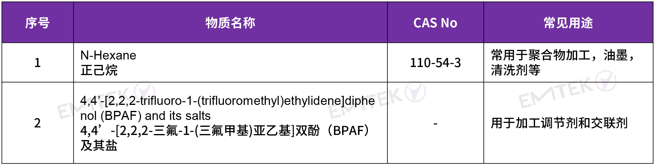 2026年02月04日,歐洲化學(xué)品管理局(ECHA)正式將下面2項(xiàng)物質(zhì)納入SVHC物質(zhì)清單。至此,SVHC物質(zhì)清單由原來的251項(xiàng)增加至253項(xiàng),此前評(píng)議的物質(zhì)4,4’-二羥基二苯甲烷(雙酚F,BPF)已被撤回。